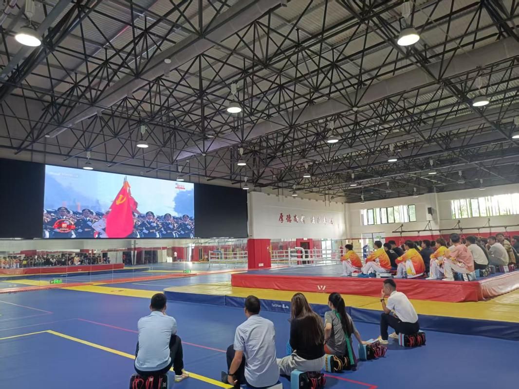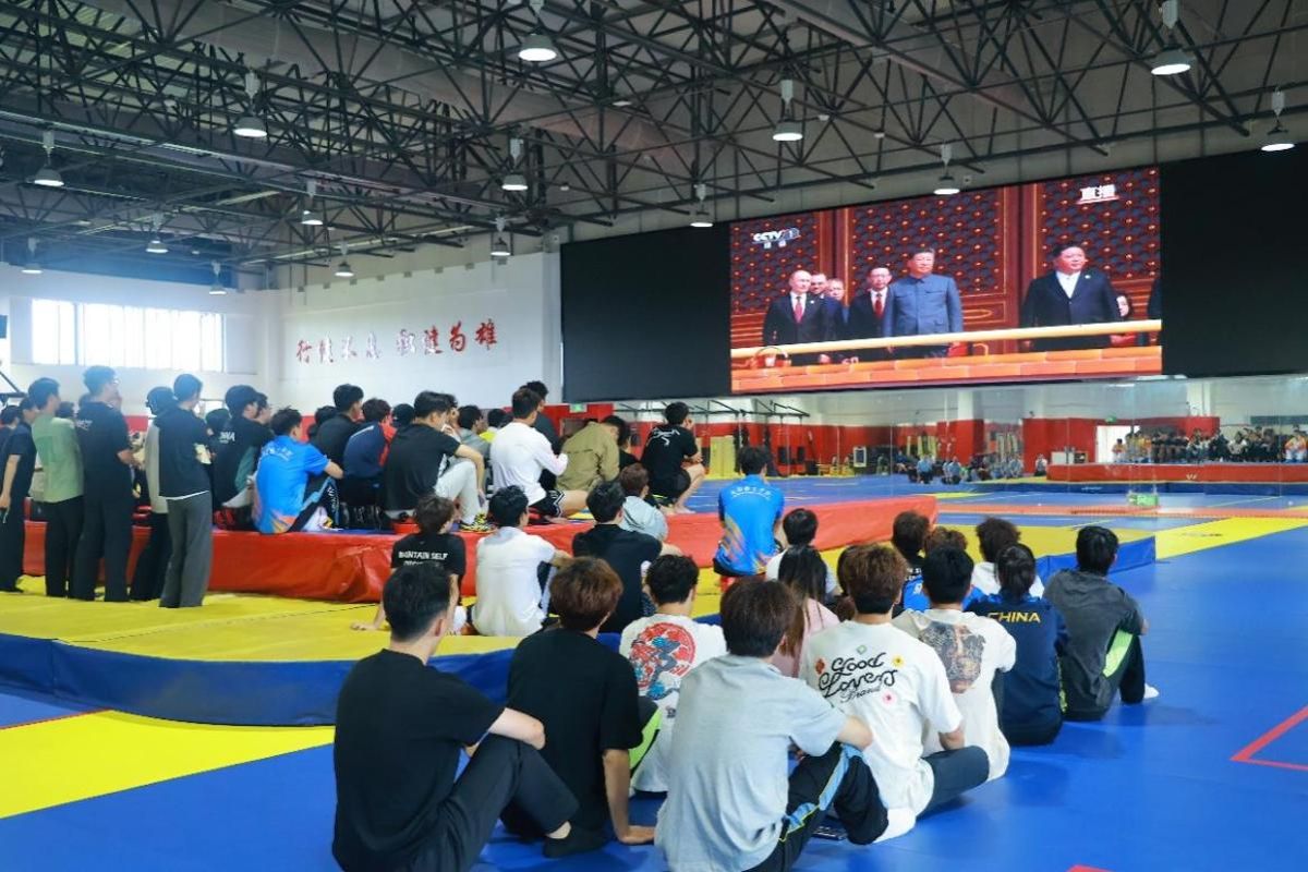 9月3日上午,武术学院组织在校全体教师、各代表队队员及返校学生齐聚武术馆,集中观看纪念中国人民抗日战争暨世界反法西斯战争胜利80周年大会直播。