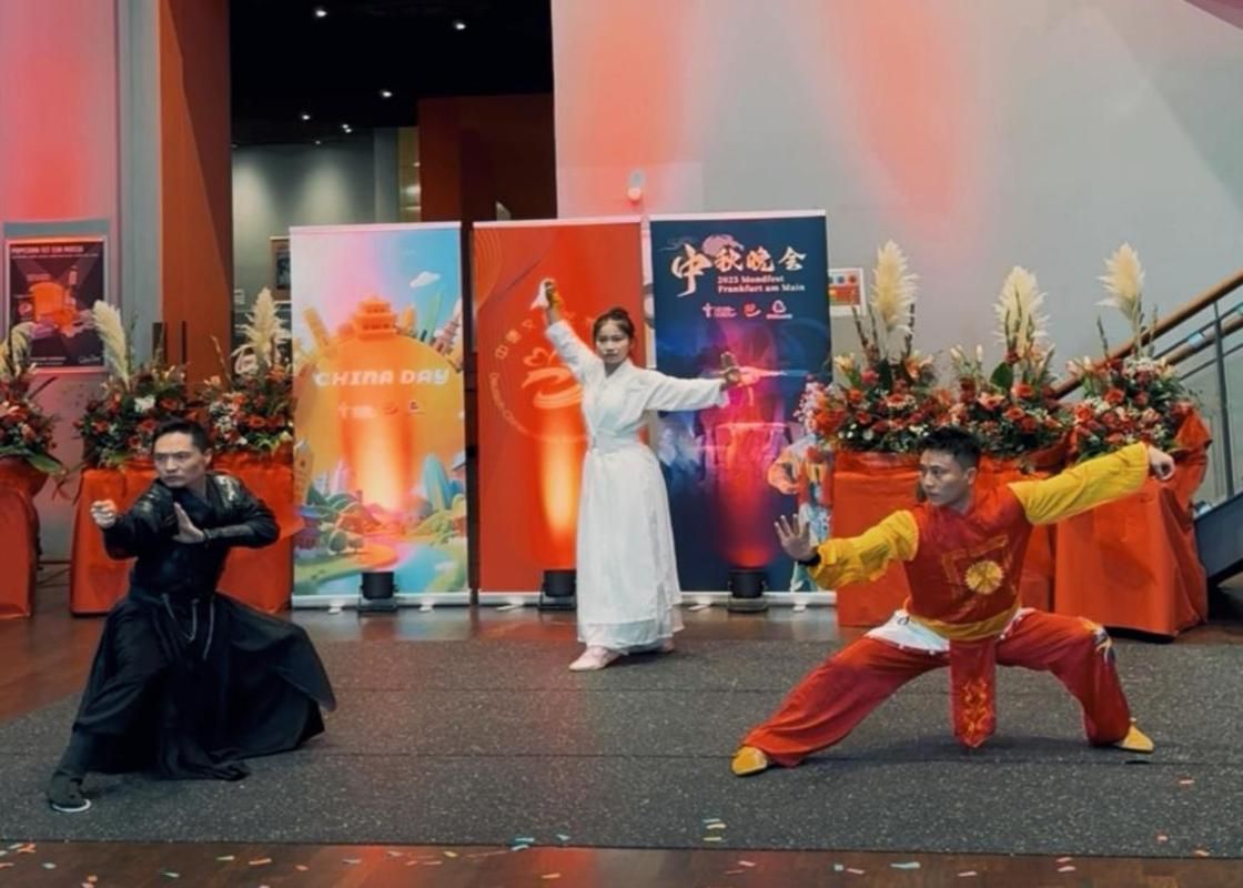 法兰克福中国节的开幕式上,周怡然一身传统武术服亮相,气定神闲。她首先带来一段九节鞭表演,动作干净利落、劲道十足,正如“秋风扫落叶”。紧接着,她手持峨眉刺登场,银光流转之间,兼具轻灵与凌厉,将这一非物质文化遗产的独特魅力展现得淋漓尽致。她表演将中华武术的力量与节奏完美融合,赢得观众阵阵惊叹。